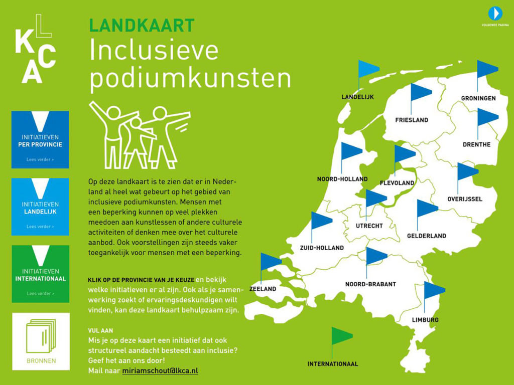 Mensen met een beperking kunnen op veel plekken meedoen aan kunstlessen of andere culturele activiteiten. Ook voorstellingen zijn steeds vaker toegankelijk voor mensen met een beperking. Op deze landkaart zie je per provincie wat er gebeurt op het gebied van inclusieve podiumkunsten. Ook als je samenwerking zoekt of ervaringsdeskundigen wilt vinden kan deze landkaart behulpzaam zijn.